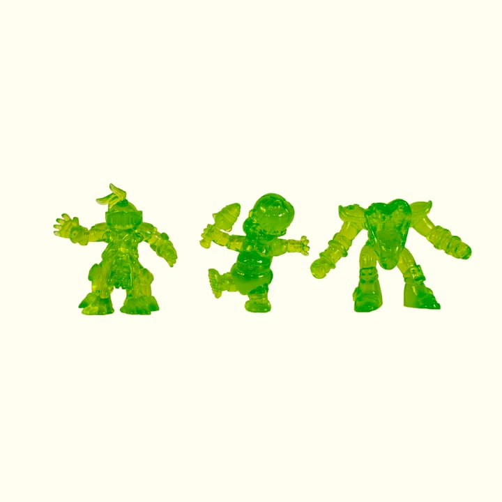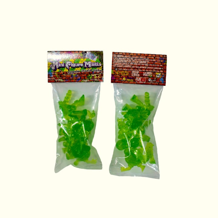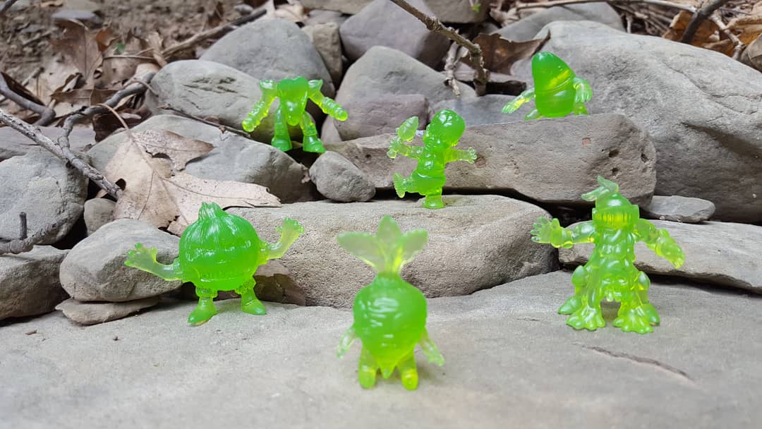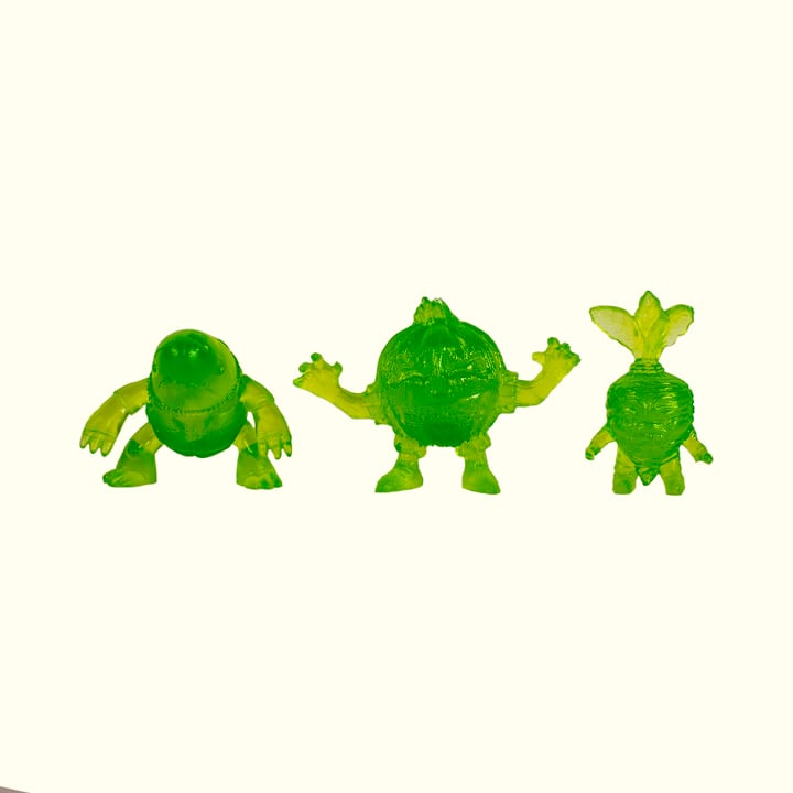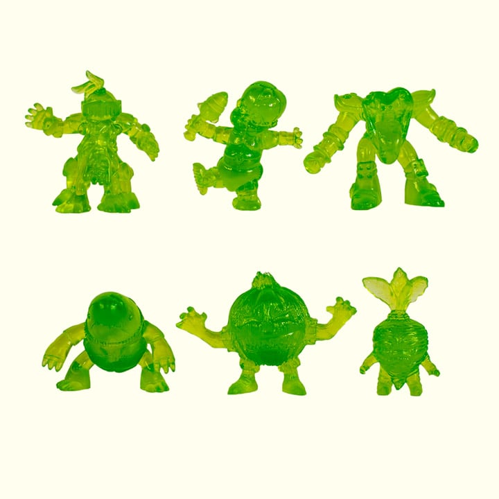 Cuddlehard, Puke Knight, Cry-Borg, Shirtle, and Grimm Gourd with Baby Deadbeet return in the fan favorite Oozarian translucent slime green, as a 6 figure set exclusive to The Mini Figure Militia!